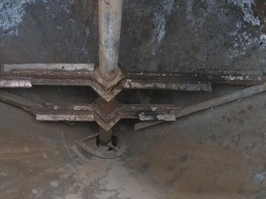 濃磷酸沉降槽是磷銨裝置的主要設備,主要使用刮泥機將濃縮后的磷酸收集,這個過程中容易出現筒底錐部的集料導致壓耙現象,需停車修理。我公司設計的刮泥機具有扭矩控制系統,在扭動達到設計值之后,攪拌軸與耙壁自動提升,等錐底部物料松動扭動下降,則攪拌軸與耙壁自動下降繼續工作,有效的避免了壓耙現場。